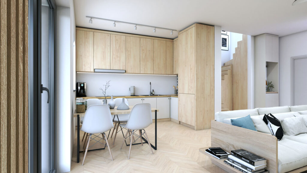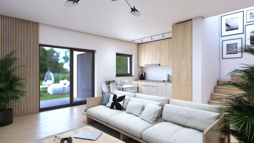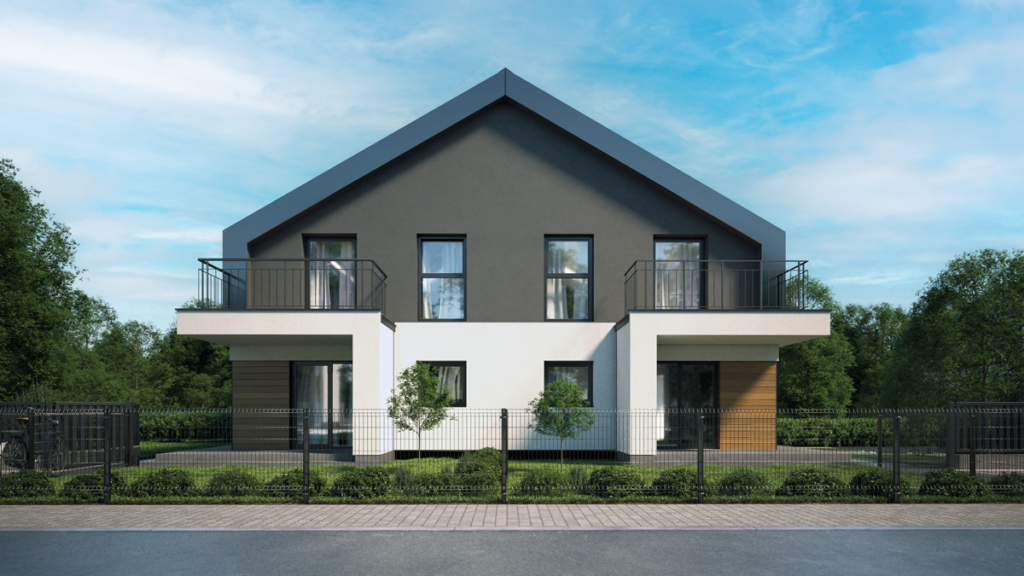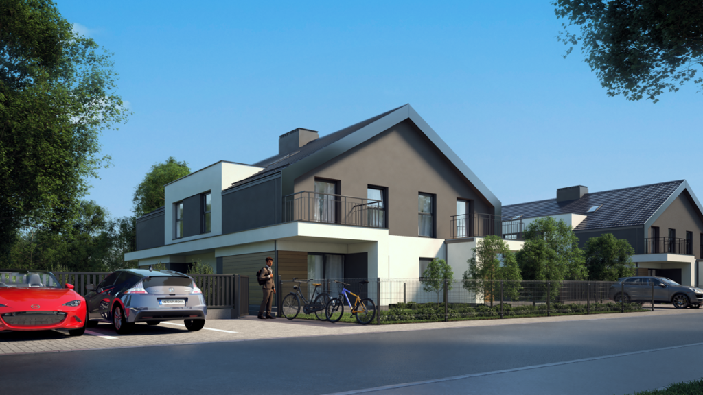 Każdy z sześciu eleganckich budynków jednorodzinnych w zabudowie bliźniaczej mieści w sobie przestronne mieszkania z balkonami, tarasami i prywatnym ogrodem.